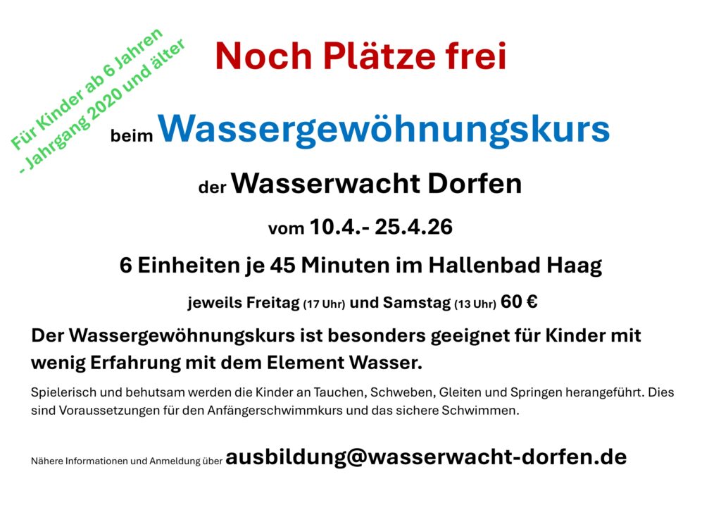 Da die Nachfrage an Schwimmkursen unsere Kapazitäten übersteigt, suchen wir Unterstützer, die der Wasserwacht OG Dorfen beitreten und sich als Schwimmkurshelfer*in oder Schwimmkursleiter*in ausbilden lassen wollen.